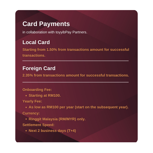 ToyyibPay is a payment platform that allows businesses and organizations to accept online payment. We provide online payment platform that offers the lowest charges with dedicated 24-hours customer support online.